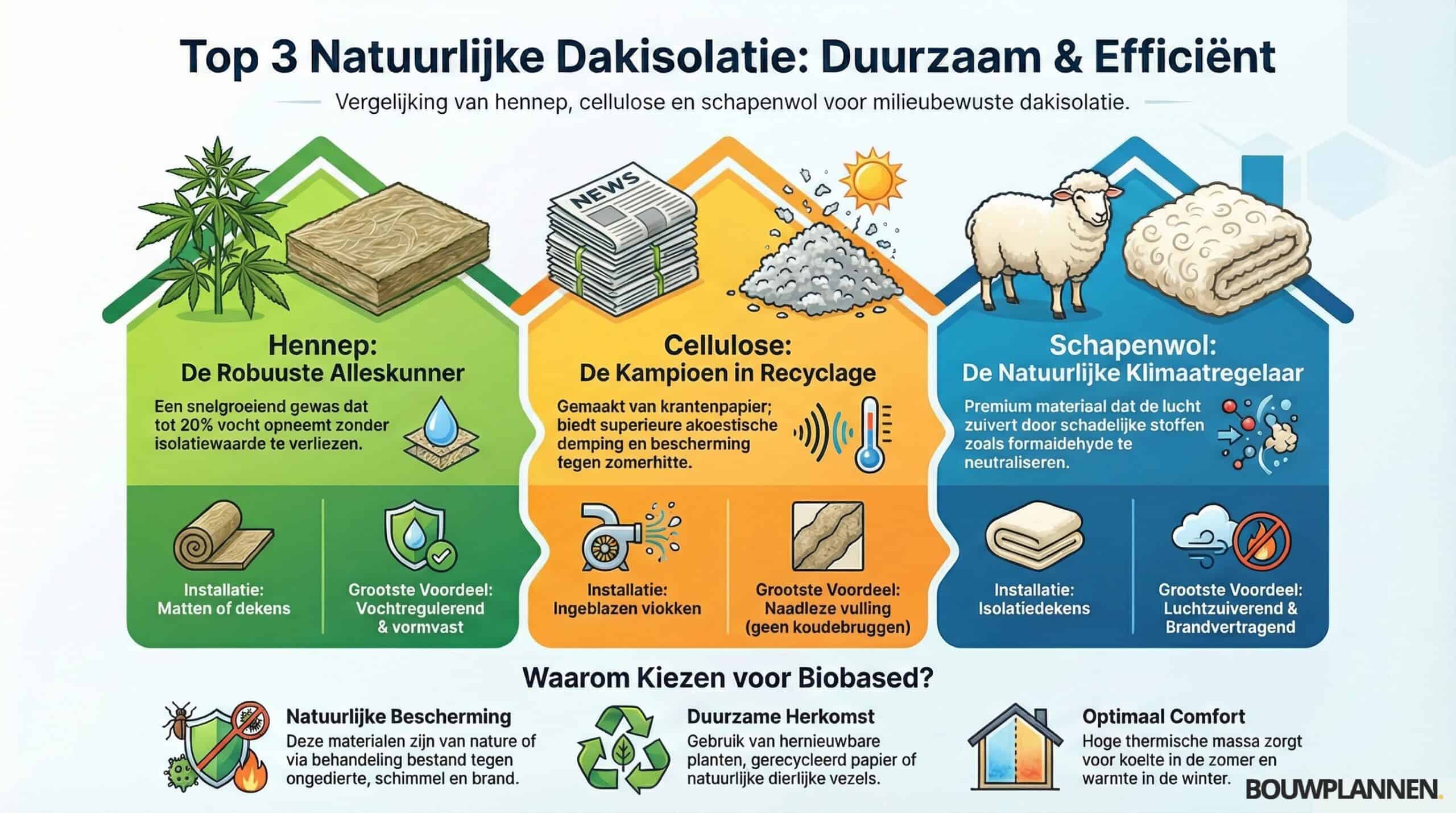De markt voor biobased isolatie groeit, maar drie materialen steken er met kop en schouders bovenuit voor dakisolatie: hennep, cellulose en schapenwol. Elk heeft zijn eigen unieke eigenschappen.