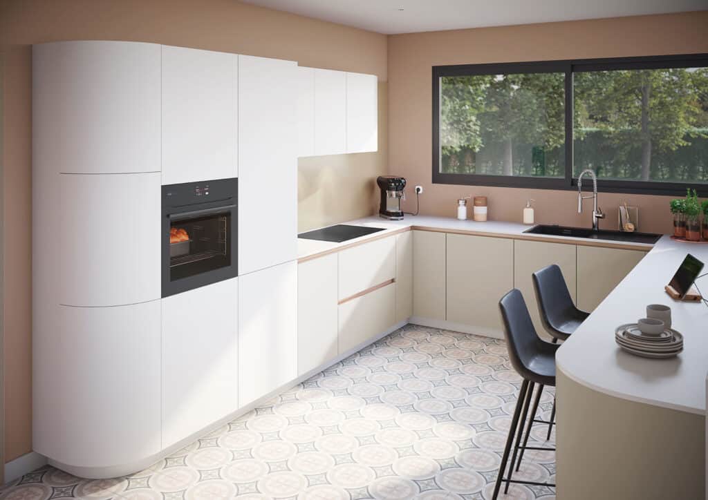 Ronde lijnen en zachte contouren winnen verder aan belang in keukens. Werkbladen, kookeilanden en kasten krijgen afgeronde vormen die de ruimte visueel verzachten en aangenamer maken in het dagelijks gebruik.