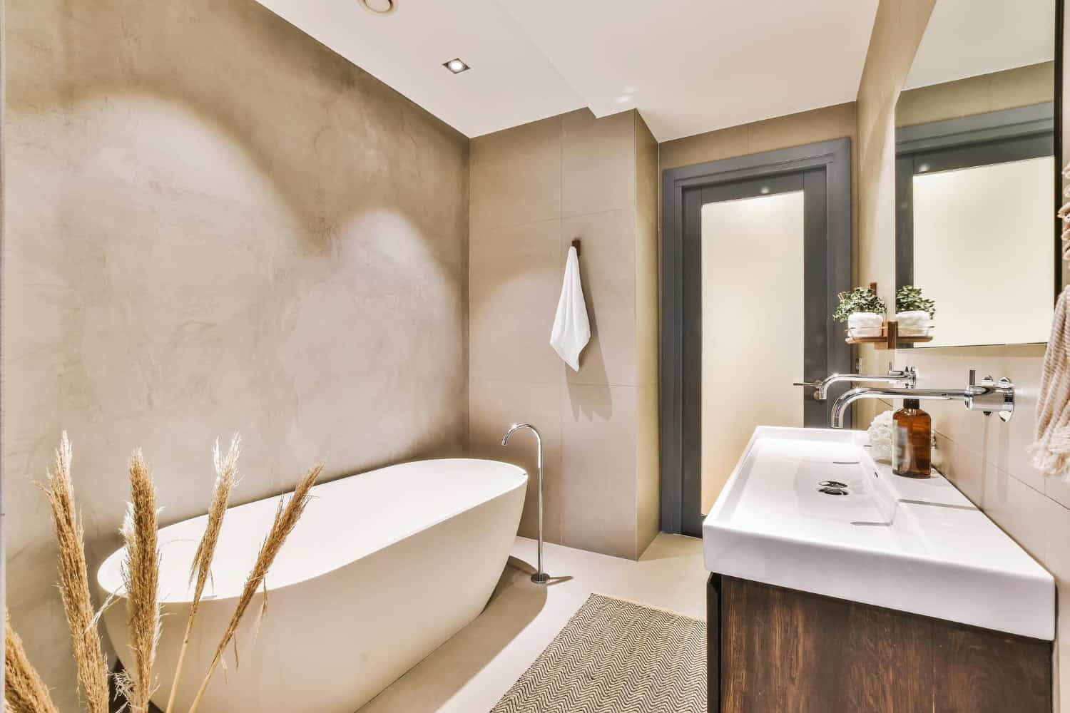 Grote tegels of doorlopende materialen zorgen voor rust omdat er minder onderbrekingen zijn. Glazen douchewanden zijn een betere keuze dan gordijnen omdat ze de zichtlijnen niet blokkeren.